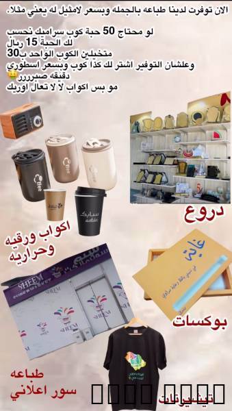 عندنا طباعة حرارية على التيشيرت واكواب وإعلانات و شعارات وغيرها وعلى حسب الطلب و وبأقل الأسعار فقط أطلب بالجملة وليس بالحبه حين تطلب بالجملة يكون السعر أرخص بكثير