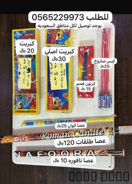 عصا الوان 8 طلقات (120 ﷼)عصا الوان 15لون (25﷼)عصا نافوره (8 ﷼) شده6 حبات ب40﷼حلاوة صفراء الحبه 4﷼ الكرتون 10حبات 35﷼ حلاوة حمراء الحبه 4 ﷼ الكرتون 10حبه 35﷼نجوم الليل الكيس5﷼ (الكيس فيه 10اعواد )كرتون فحم 15﷼شد الحبل (12حبل) ب10﷼الصواريخ كيس 25﷼قنبله الكرتون20﷼ (20حبه )كوبرا حبه 4 ﷼ ( كرتون 10حبات 35﷼)ديناميت اصلي الحبه 30﷼ كرتون(10علب) 280﷼ديناميت العادي 20﷼ كرتون(10علب) 180 ريالثوم اصلي العلبه 4﷼ كرتون(50علبه) 180﷼ثوم عادي 2 ﷼ كرتون(50علبه) 100﷼سمبوسه كرتون 10﷼فراشه 12حبه كرتون 10﷼دوار 12 حبه كرتون 10﷼يوجد توصيل لكل مناطق السعوديه