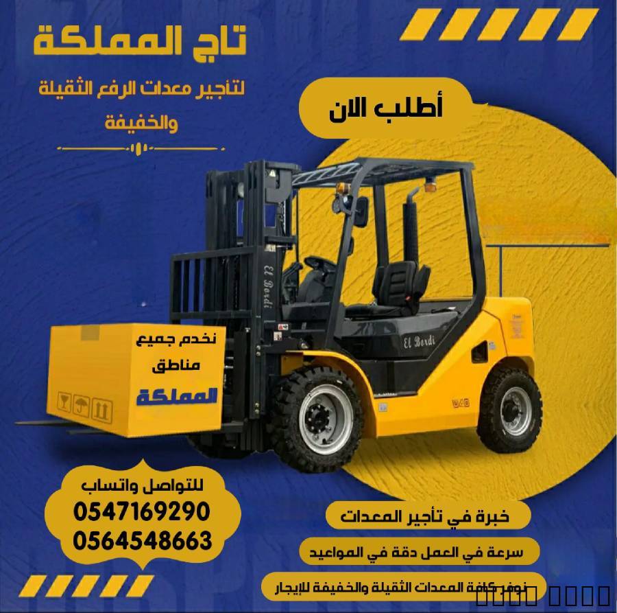 تاج المملكة لتأجير المعدات الثقيلة والخفيفة – نخدم مشاريعك في جميع مناطق المملكة نوفّر لك أسطولًا متكاملًا من المعدات الحديثة، جاهزة للعمل الفوري، لتلبية احتياجات المقاولين والشركات والمشاريع الكبرى والصغرى. رافعات شوكية للإيجار رافعة شوكية 1.5 طن رافعة شوكية 2 طن رافعة شوكية 3 طن رافعة شوكية 5 طن رافعة شوكية 7 طن رافعة شوكية 10 طن رافعة شوكية 15 طن رافعة شوكية 20 طن رافعة شوكية 25 طن رافعة شوكية 30 طن سيزر لفت للإيجار سيزر لفت 6 متر سيزر لفت 8 متر سيزر لفت 10 متر سيزر لفت 12 متر سيزر لفت 14 متر مان لفت للإيجار مان لفت مفصلي مان لفت تلسكوبي ارتفاعات متعددة حسب الطلب كرينات للإيجار كرين متحرك كرين هيدروليكي حمولات تبدأ من 10 طن حتى 100 طن وأكثر بوكلينات (حفارات) للإيجار بوكلين صغير بوكلين متوسط بوكلين كبير شيولات للإيجار شيول صغير شيول متوسط شيول كبير بلدوزرات للإيجار بلدوزر صغير بلدوزر متوسط بلدوزر كبير دنابر (Dumpers) للإيجار دنابر صغير دنابر متوسط دنابر كبير بوكات (Bobcats) للإيجار بوكات صغير بوكات متوسط جي سي بي (JCB) للإيجار جي سي بي متعدد الاستخدامات