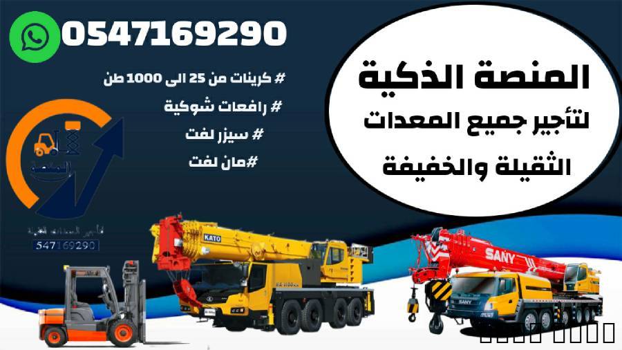 المنصة لتأجير المعدات الثقيلة والخفيفة – واتساب: 0547169290نخدم مشاريعك من الأساس إلى الإنجاز. نوفر تأجير جميع أنواع المعدات داخل مدينة الرياض، بجاهزية تشغيل فورية وصيانة دورية، مع خيارات تأجير مرنة حسب احتياجك.المعدات المتوفرة:- معدات الرفع والنقل: كرينات هيدروليكية، رافعات شوكية، مان لفت، سيزرلفت- معدات الحفر والتحميل: شيولات، حفارات، بوبكات، قلابات- معدات الطاقة والهواء: مولدات كهربائية، كمبروسرات، كشافات إنارة- معدات التشطيب والمساندة: سطحات، تريلات، دكاكات، خلاطات، معدات قص وتكسيرمميزات الخدمة:- تأجير يومي، أسبوعي، شهري حسب الطلب - معدات حديثة بجاهزية تشغيل فورية - سرعة في التوصيل داخل الرياض - أسعار مدروسة وتعامل احترافي - التواصل حصري عبر واتساب فقط