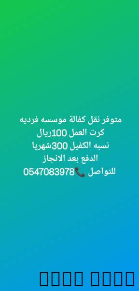 متوفر نقل كفالة موسسه فرديه كرت العمل 100ريال نسبه الكفيل 300شهريا الدفع بعد الانجاز للتواصل ????0547083978