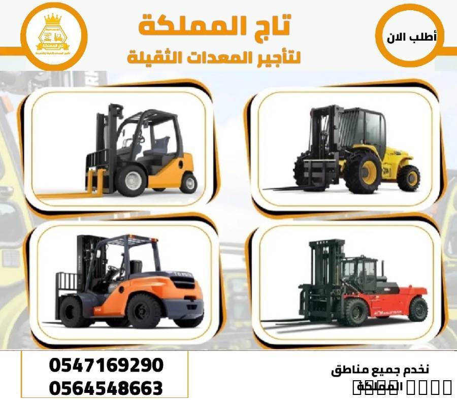 تاج المملكة لتأجير المعدات الثقيلة والخفيفةنضع بين يديكم أسطول متكامل من المعدات الحديثة، جاهزة للعمل في جميع مناطق المملكة، مع التزامنا بالجودة والسرعة والاحترافية. رافعات شوكية للإيجاررافعة شوكية 1.5 طن للإيجار رافعة شوكية 2 طن للإيجار رافعة شوكية 3 طن للإيجار ... حتى 30 طن للإيجار سيزر لفت للإيجار (ديزل وكهرباء)سيزر لفت 6 متر للإيجار سيزر لفت 7 متر للإيجار سيزر لفت 8 متر للإيجار ... حتى 22 متر للإيجار مان لفت للإيجارمان لفت 10 متر للإيجار مان لفت 11 متر للإيجار ... حتى 58 متر للإيجار كرينات للإيجاركرينات بجميع الأحجام تبدأ من 20 طن ... حتى 300 طن للإيجار معدات إضافية متوفرة للإيجارشيولات – بوكات – جي سي بي – مرلوهات تليهندر بوكلينات – فرادات – سطحات وجميع المعدات الثقيلة والخفيفة ---???? للتواصل عبر واتساب مباشرة: 0564548663 0547169290