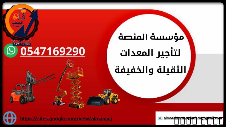جميع المعدات جاهزة للتأجير – وكالة المنصة | الرياضفي عالم المشاريع، الجاهزية تبدأ من المعدات.  نحن في وكالة المنصة لتأجير المعدات الثقيلة والخفيفة نوفّر لك كل ما تحتاجه من معدات حديثة، جاهزة للتشغيل، وتخدم جميع مراحل العمل من التأسيس إلى التشطيب.المعدات المتوفرة لدينا تشمل:معدات الرفع:- مان لفتات بجميع الأطوال (10 إلى 45 متر)  - سيزرلفتات كهربائية وديزل (6 إلى 18 متر)  - رافعات شوكية (كهربائية – ديزل – غازية) من 1.5 طن إلى 10 طن  - كرينات متعددة الأحجاممعدات الحفر والتحميل:- بوكلينات  - شيولات  - بلدوزرات  - جي سي بي (JCB)  - بوكات صغيرة للمواقع الضيقةمعدات خفيفة ومساندة:- مولدات كهربائية  - ضواغط هواء  - رافعات مواد  - معدات تشطيب وتنظيف  - أدوات دعم للمواقع الصناعية والتجاريةمزايا التأجير من المنصة:- تأجير يومي، أسبوعي، شهري حسب احتياجك  - جاهزية فورية وصيانة دورية  - موديلات حديثة لعام 2025  - توصيل سريع داخل مدينة الرياض  - تواصل حصري عبر واتساب فقطللتواصل والحجز:  واتساب فقط: 0547169290  الرياض – المملكة العربية السعوديةالمنصة لتأجير المعدات – كل المعدات في مكان واحد، جاهزة وقت ما تحتاجها.