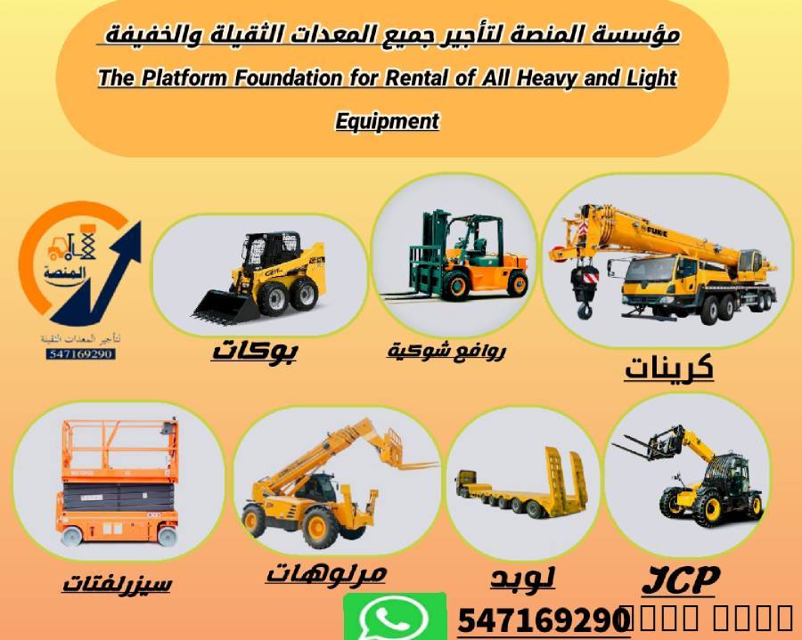 المنصة الذكية لتأجير المعدات – الرياضنخدم مشاريعك بأحدث المعدات الثقيلة والخفيفة، جاهزة للتشغيل وبأعلى مستوى من النظافة والصيانة.  رافعات شوكية: مثالية لتحميل وتفريغ البضائع داخل المواقع والمستودعات بكفاءة وسرعة.  سيزرلفت: منصة رفع مستقرة وآمنة، تتيح تنفيذ أعمال التشطيب والتركيب في الارتفاعات.  مان لفت: وصول مباشر وسريع لأعمال الصيانة والإنشاءات في الأماكن المرتفعة.تأجير يومي وأسبوعي – خدمة احترافية – معدات جاهزة  للتواصل عبر واتساب فقط: 0547169290