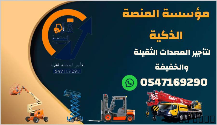 المنصة لتأجير المعدات الثقيلة والخفيفة – واتساب: 0547169290نوفّر جميع المعدات التي يحتاجها موقعك، بجاهزية تشغيل فورية وخدمة سريعة داخل الرياض.المعدات المتوفرة:- كرينات هيدروليكية ومتنقلة - رافعات شوكية ديزل وكهرباء - سيزرلفتات داخلية وخارجية - مان لفت بارتفاعات متعددة - شيولات، حفارات، بوبكات - قلابات، تريلات، سطحات - مولدات كهربائية، كمبروسرات - معدات تحميل، رفع، تشطيب، حفر، نقلمميزات الخدمة:- تأجير يومي، أسبوعي، شهري حسب الطلب - معدات نظيفة وحديثة بجاهزية تشغيل - سرعة في التوصيل داخل الرياض - أسعار مدروسة وتعامل راقٍ - التواصل حصري عبر واتساب فقط