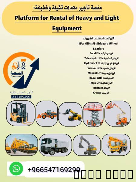 مؤسسة المنصة لتأجير المعدات الثقيلة والخفيفة – الرياضفي كل مشروع ناجح، تبدأ القوة من المعدات. مؤسسة المنصة توفر لك كل ما تحتاجه لتجهيز موقعك، من أول حفرة حتى آخر تشطيب. نحن لا نبيع وعودًا، نحن نجهزك للعمل فورًا.نخدم المقاولين، شركات البناء، المصانع، والمستودعات داخل مدينة الرياض، مع أسطول متكامل من المعدات الجاهزة للتشغيل.المعدات المتوفرة:رافعات شوكية ديزل وكهرباء سيزرلفتات داخلية وخارجية مان لفت بارتفاعات متعددة شيولات، حفارات، بوبكات قلابات، تريلات، سطحات مولدات كهربائية، كمبروسرات كرينات هيدروليكية ومتنقلة معدات تحميل، رفع، تشطيب، حفر، نقلمميزات الخدمة:تأجير يومي، أسبوعي، شهري حسبللتواصل واتساب عبر الرقم 0547169290