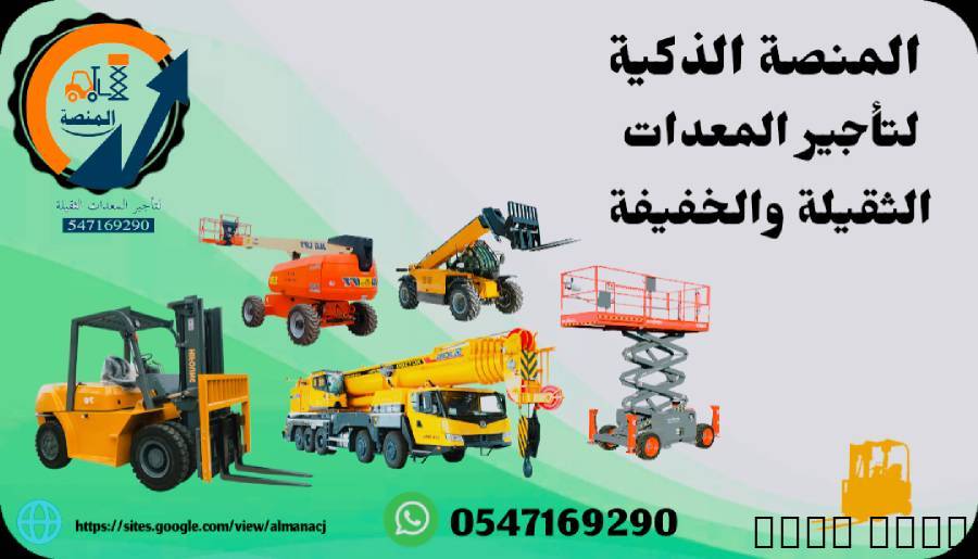 مؤسسة المنصة الذكية لتأجير المعدات – الرياضنوفر جميع المعدات الثقيلة والخفيفة بجاهزية تشغيل فورية.  سيزرلفتات، مان لفتات، رافعات شوكية، جي سي بي، بوكلينات، شيولات، مولدات، ضواغط، وأكثر.  تأجير يومي، أسبوعي، شهري – توصيل سريع داخل الرياض – تواصل عبر واتساب فقط.???? 0547169290  المنصة الذكية لتأجير المعدات – جاهز تبدأ؟ نحن نجهّزك قبل ما تبدأ.