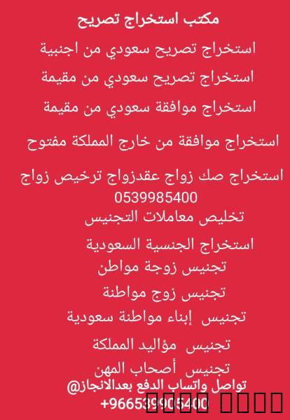 نوفر لكم خدمات استخراج تصاريح الزواج من المقيمين أو المواطنين بطريقة نظامية وسريعة، ونتابع لكم المعاملة من البداية حتى صدور التصريح بإذن الله.خدماتنا تشمل: ●استخراج تصاريح الزواج من خارج المملكة ●استخراج موافقة زواج مواطن من اجنبية والعكس اجنبي من سعوديه 0539905400●صحيح زواج بعد زواج●تعديل بيانات زواج قديم●استشارات قانونية متعلقة بتصاريح > مرحباً بكم في مكتب استخراج تصاريح الزواجنوفر لكم خدمات استخراج تصاريح الزواج من المقيمين أو المواطنين بطريقة نظامية وسريعة، ونتابع لكم المعاملة من البداية حتى صدور التصريح بإذن الله.خدماتنا تشمل:●استخراج الجنسية السعودية ●استخراج تصاريح الزواج من خارج المملكة ●استخراج موافقة زواج مواطن من اجنبية والعكس اجنبي من سعوديه ●صحيح زواج بعد زواج●تعديل بيانات زواج قديم●استشارات قانونية متعلقة بتصاريح الزواج♻️الدفع بعد الانجاز تواصل واتساب https://api.whatsapp.com/send?phone=966539905400