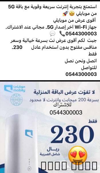 استمتع بتجربة إنترنت سريعة وقوية مع باقة 5G من موبايلي ???????? أقوى عرض من موبايليجهاز Wi-Fi آخر إصدار 5G. مجاني عند الاشتراك. 0544300003???? ????جبت لكم أقوى عرض نت بسرعة خيالية وسعر منافس مفتوح بدون استخدام عادل 230. فقطاتصل ونحن نصلللتواصل0544300003