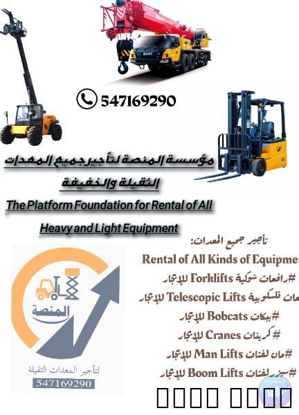 المنصة لتأجير المعدات الثقيلة والخفيفة – واتساب: 0547169290???? الرياض – جاهزية تشغيل فورية ???? تأجير يومي، أسبوعي، شهري حسب احتياجكنوفّر جميع المعدات المطلوبة لتجهيز موقعك، من الرفع إلى الحفر، ومن الطاقة إلى التشطيب، بخدمة سريعة ومعدات نظيفة.المعدات المتوفرة:- معدات الرفع والمناولة: كرينات هيدروليكية، رافعات شوكية ديزل وكهرباء، سيزرلفت، مان لفت- معدات الحفر والتحميل: شيولات، حفارات، بوبكات، قلابات، تريلات، سطحات- معدات الطاقة والهواء: مولدات كهربائية، كمبروسرات، كشافات إنارة- معدات التشطيب والمساندة: دكاكات، خلاطات، معدات قص وتكسير، معدات تحميل ونقل وتسويةمميزات الخدمة:- معدات حديثة بجاهزية تشغيل - توصيل سريع داخل الرياض - أسعار مدروسة وتعامل راقٍ - التواصل حصري عبر واتساب فقط