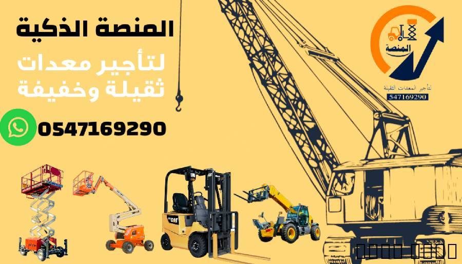 المنصة لتأجير المعدات الثقيلة والخفيفة – واتساب: 0547169290???? الرياض – جاهزون لتجهيز موقعك بجميع المعدات المطلوبة ???? تأجير يومي، أسبوعي، شهري حسب احتياج المشروعنوفّر معدات حديثة بجاهزية تشغيل فورية، تخدم المقاولين والمصانع والمستودعات، مع سرعة في التوصيل داخل الرياض.المعدات المتوفرة:- كرينات هيدروليكية ومتنقلة - رافعات شوكية ديزل وكهرباء - سيزرلفتات داخلية وخارجية - مان لفت بارتفاعات متعددة - شيولات، حفارات، بوبكات - قلابات، تريلات، سطحات - مولدات كهربائية، كمبروسرات - معدات تحميل، رفع، تشطيب، حفر، نقلمميزات الخدمة:- معدات نظيفة وحديثة - تأجير مرن حسب مدة المشروع - أسعار مدروسة وتعامل راقٍ - التواصل حصري عبر واتساب فقط---