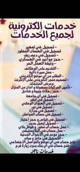 الخدمات المقدمة تخليص جميع المعاملات في الدوائر الحكومية اصدار وثيقة عمل حر نقل كفاله اصدار تأشيرات الغاء بلاغ هروب بلاغ هروب إقامة منتهية إعفاء من المقابل المالي تصفير المقابل المالي تجديد الاقامة منتهية تحويل زائر الى مقيم الغاء خروج نهائي مؤقت منتهي مؤقت ساري جميع انواع البرنت تمديد زيارات عائلية نقل معلومات جواز إعفاء من الرسوم للاقامة المنتهية حل مشاكل التأمينات الإجتماعيه وحماية الأجور تأشيرات زيارة تأشيرات للبحرين توفير تأشيرات كندا للأجانب .حجز مواعيد تساهيل توفير سيارات ذهاب وعوده توفير لافندر ارامكو الامن السيبراني ارامكو فتح سجل تجاري فتح شركات الاستثمار للأجانب ( خدمي صناعي تجاري ) للمزيد من المعلومات و الاستفسار الاتصال على الرقم 0532301888