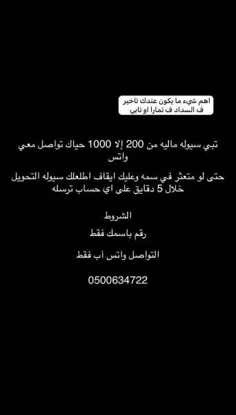 سيوله ماليه فوريه خلال 10 دقايق من 200 إلا 5000 حتى لو عليك ايقاف خدمات ننفذ ونحولك في اي حساب ترسله