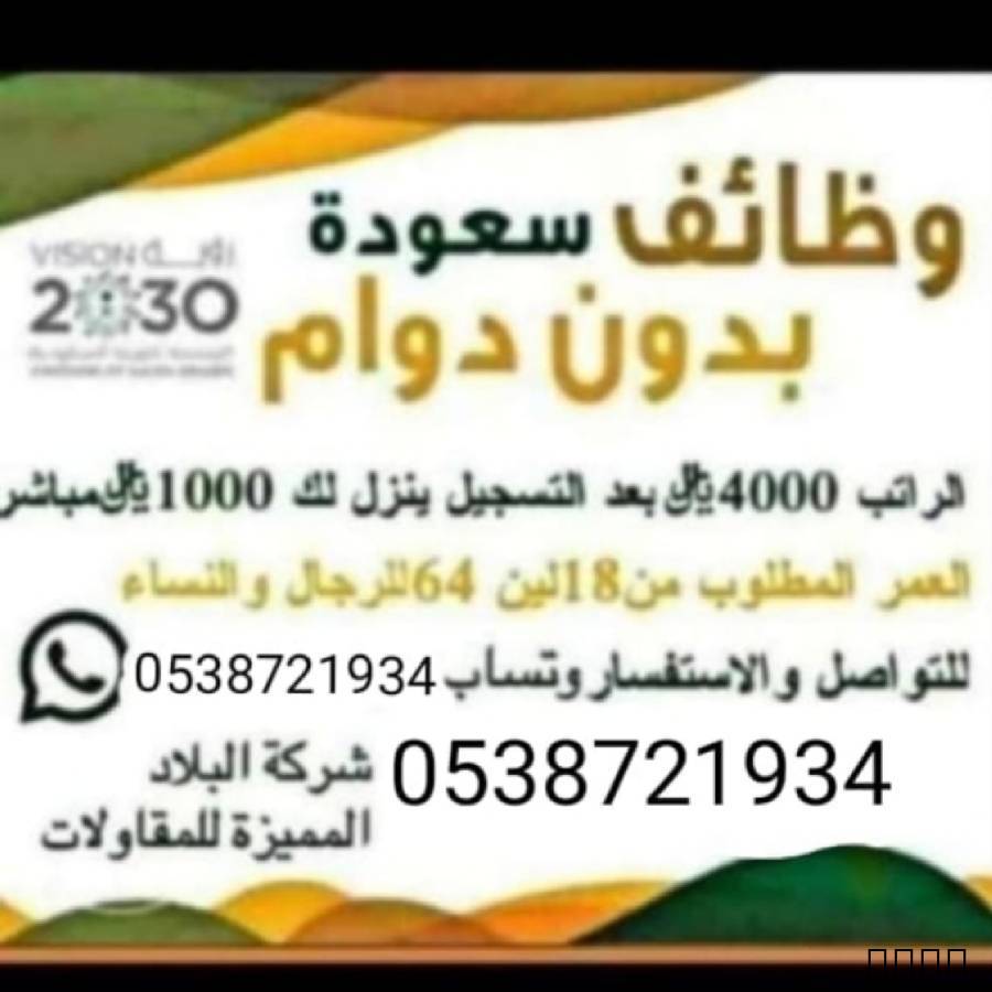 سعودة اون لاين العدد المطلوب 85 موضف ينزل لك الراتب على طول على حسابك 4500 ريال صافي لك احتاج موضفين بشركه مضمونه تقدم رواتب شهريا 4500 اريال نساء + رجال ملاحظة هامه للتسجيل تسجيلك معنا مآثر عليك اذا كنت في التامينات قبل أو مسجل في الضمان أو في حساب المواطن الي يسجل الان يستلم هذا الشهر 4500 ريال للتواصل عبر الوتساب 0538721934