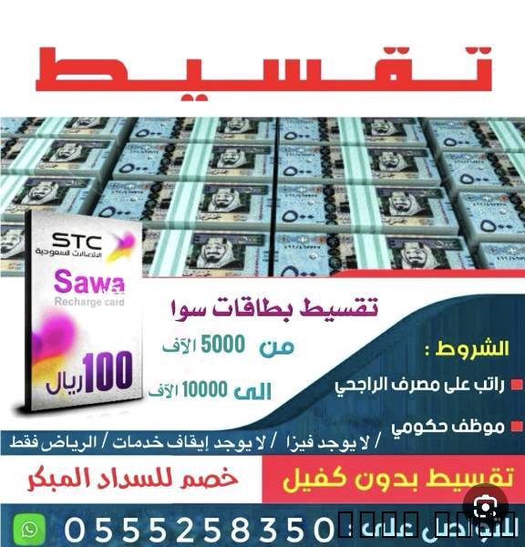 يتوفر لدينا تقسيط بطاقات سواء للعملاء مصرف الراجحي {{ في مدينة الرياض فقط }} بأقل فوائد مخفضة ، 5 آلاف ريال إلى 10 الاف ريال للتواصل {{ واتساب فقط }} على الرقم ( رقم الجوال 0555258350 )